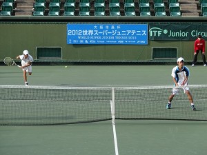 10月24日、竹元佑亮選手(相生学院高校)と組んでダブルスに出場しました。イギリス人選手と台北の選手のペア相手に1stセットを6-2と幸先よく先制し、続く第2ndセッもト2-5の劣勢から、タイブレークにまで持ち込みましたがそのセットを失い、Fセットのスーパータイブレークも8-10で失い敗退してしまいました。チャンスがあっただけに非常に残念。